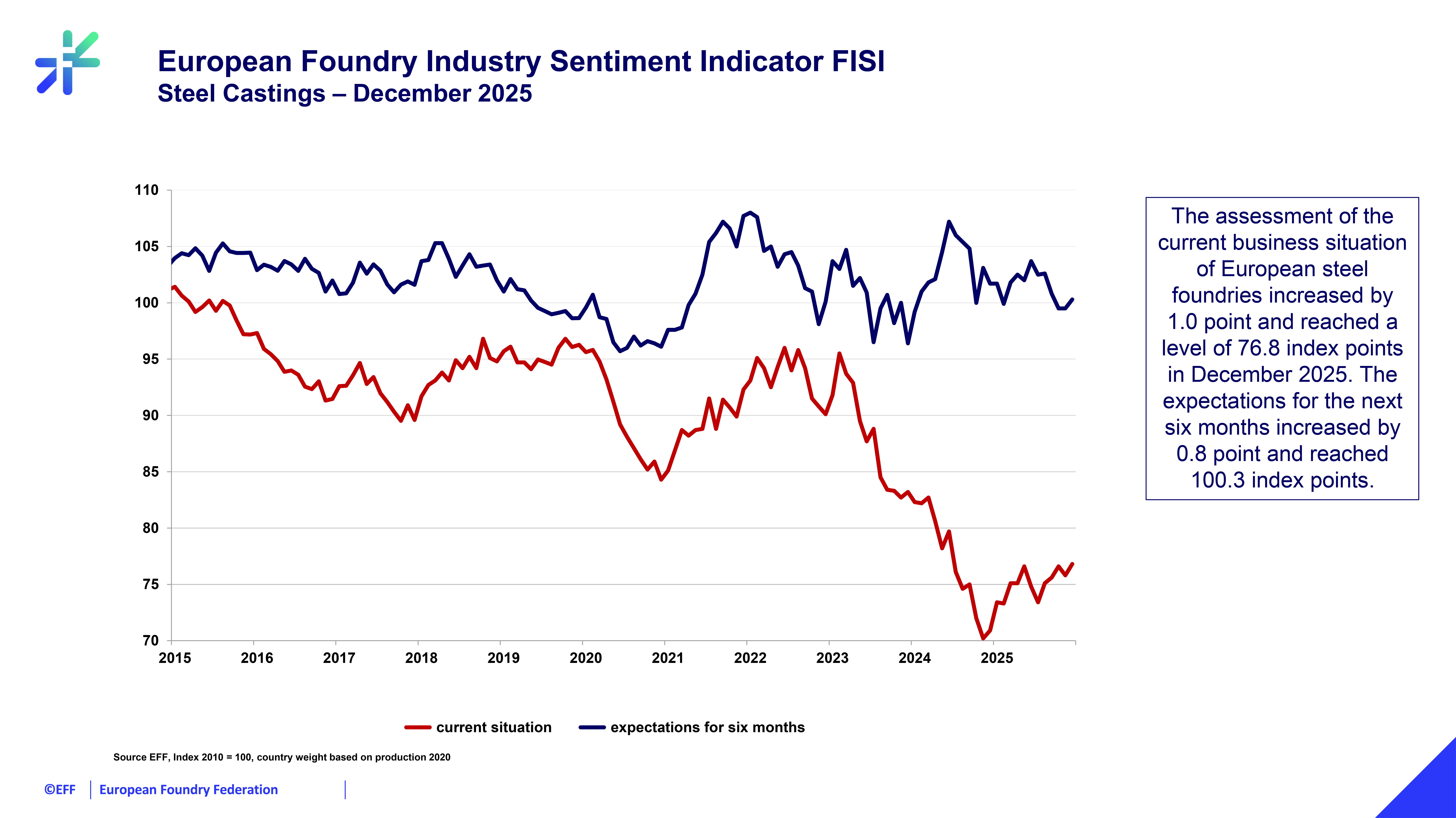 L’indice FISI (Foundry Industry Sentiment Indicator) est publié chaque mois par l’association européenne de fonderie EFF à partir des réponses des organisations membres, dont pour la France, la Fédération Forge Fonderie, sur le climat des affaires dans le secteur de la fonderie (fonte, acier et non-ferreux) à date et leurs attentes pour les six prochains mois.