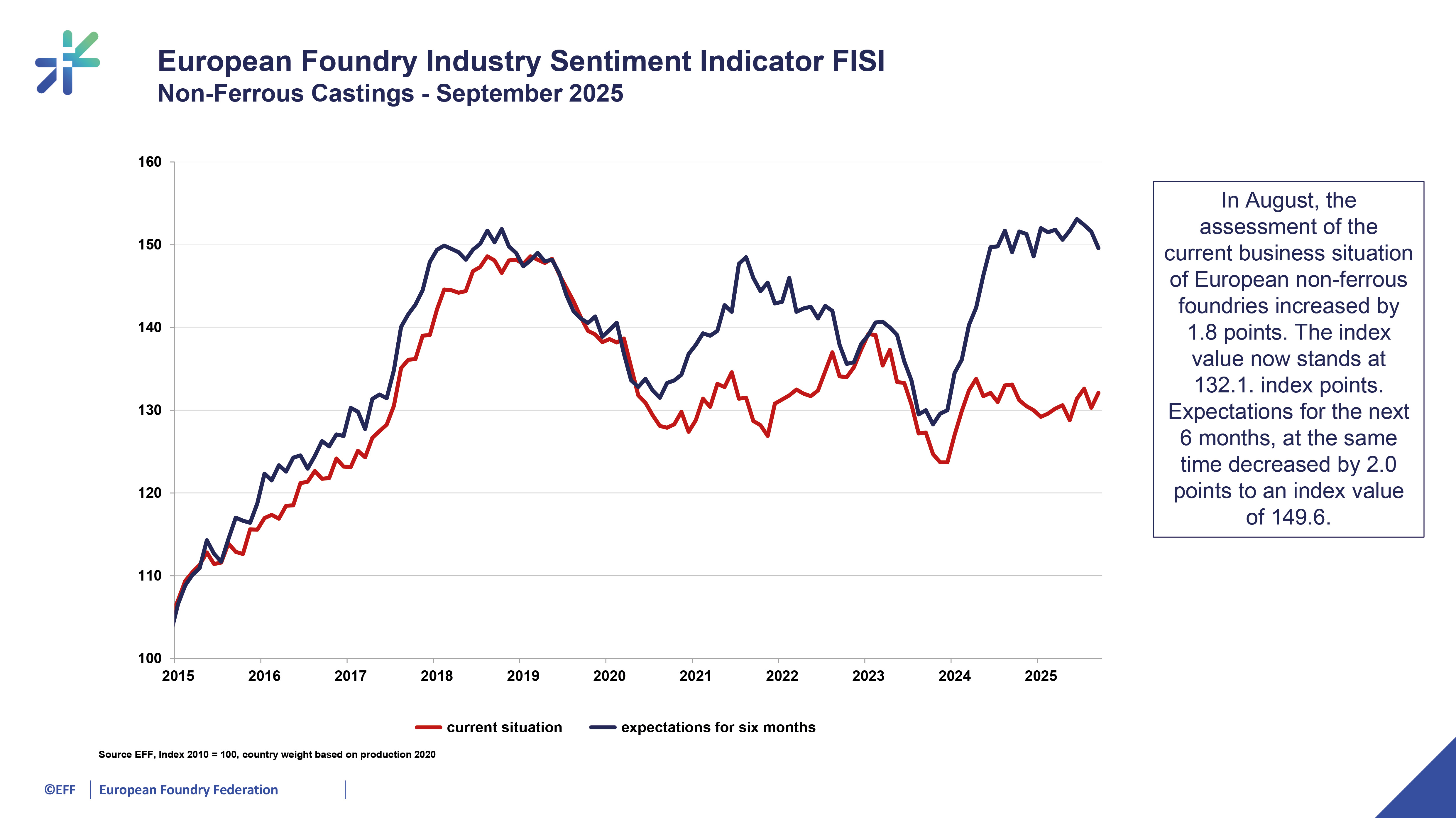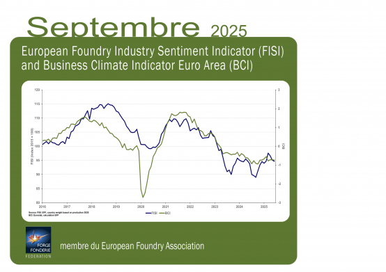 It is worth mentioning that in September 2025 there was a noticeable increase in the trend in the production of cast iron, steel and non-ferrous metal castings, compared to the value of August 2025. However, the general value of the indicator was influenced by the slightly pessimistic expectations of the surveyed foundries as to the forecasts for the coming months. ![]() Trends in the production of castings are a litmus test of the general situation of the industry in Europe. The reduction in production related to the decline in orders is noticeable in almost all EU countries. Geopolitical uncertainty, implemented tariffs on imported raw materials, electricity prices are factors that have a huge impact on the current picture of the European foundry industry. Taking into account other macroeconomic indicators, it should be mentioned that the Business Climate Index (BCI), published by the European Commission, reached a level of -0.73 in September 2025, compared to the previous reading of -0.72 in August 2025. The Eurozone Manufacturing PMI in September 2025 decreased by 0.7 point from the level of 50.5 in August 2025 and reached a level of 49.8 point. . The European Foundry Federation, which brings together 23 national foundry associations and foundry chambers of commerce from 22 European countries, monitors the situation of the industry on an ongoing basis. _____________________________________________________________ The FISI – European Foundry Industry Sentiment Indicator – is the earliest available composite indicator providing information on the European foundry industry performance. It is published by EFF every month and is based on survey responses of the European foundry industry. The EFF members are asked to give their assessment of the current business situation in the foundry sector and their expectations for the next six months. The BCI – Business Climate Indicator – is an indicator published by the European Commission. The BCI evaluates development conditions of the manufacturing sector in the euro area every month and uses five balances of opinion from industry survey: production trends, order books, export order books, stocks and production expectations. Purchasing Managers' Index (PMI) - in the Euro area is an indicator of the economic health of the manufacturing sector. It is based on such indicators as: new orders, inventory levels, production, supplier deliveries and the employment environment. Please find the chart enclosed or combined with additional information at eff-eu.org/. Background information on EFF: EFF is the umbrella organisation of the national European foundry associations. The organisation, founded in 1953, has 22 European member states and works to promote the economical, technical, legal and social interests of the European foundry industry. At the same time, EFF implements activities which aim at developing national foundry industries and co-ordinating their shared international interests. The General Secretariat is situated in Düsseldorf since 1997. EFF represents 4 400 European foundries. Nearly 260 000 employees are generating a turnover of 39 billion Euro. European foundries are recruiting 20 000 workers and engineers per year. The main customer industries are e.g. the automotive, the general engineering and the building industries as well as the electrical engineering industry. No industrial sector exists without using casted components. Further information at eff-eu.org/ and LinkedIn EFF. EFF – European Foundry Federation mail: info@eff-eu.org ________________________________________ |