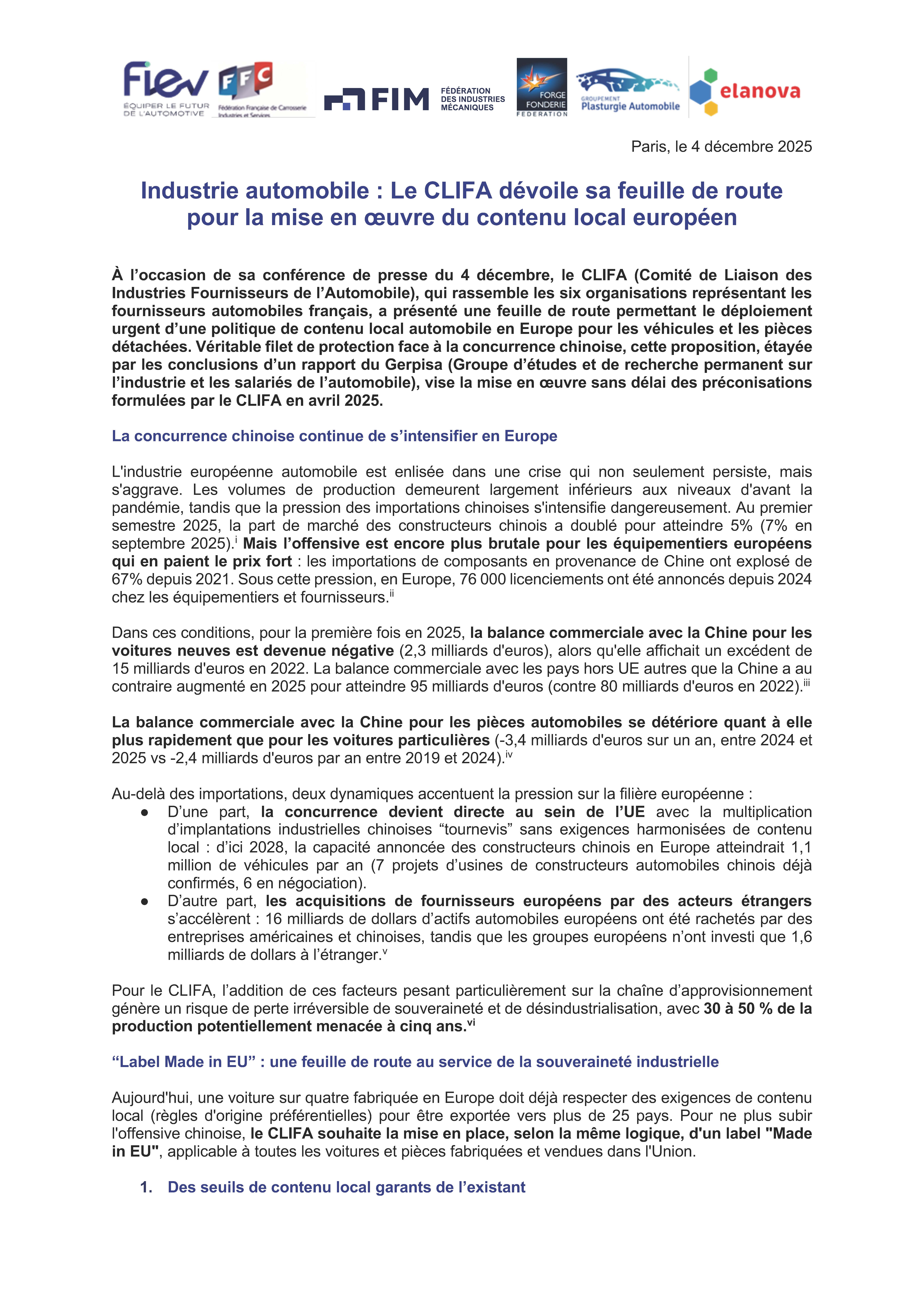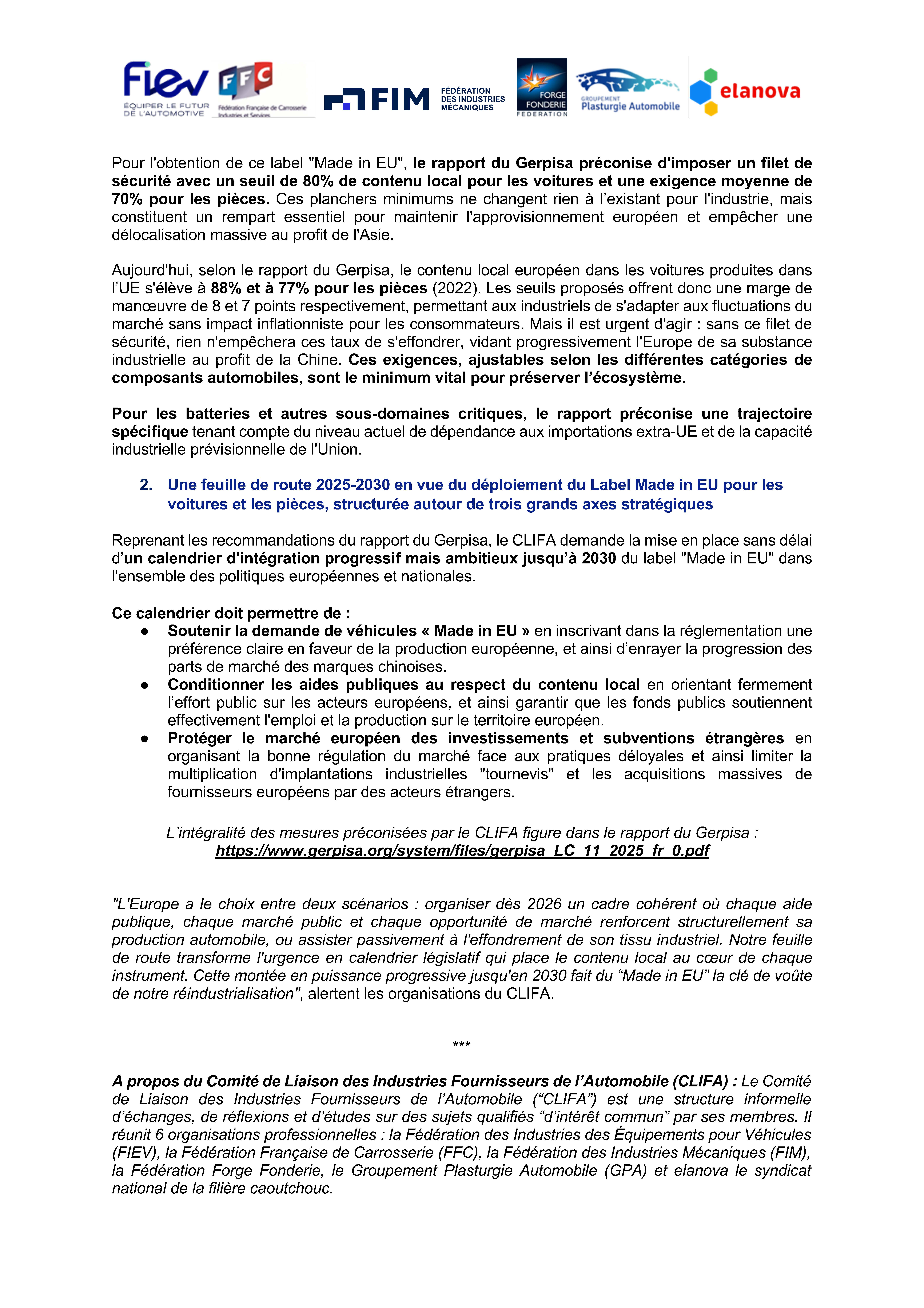 80 % de contenu local européen dans les véhicules, 70 % en moyenne pour les pièces comme condition de toute politique et de tout financement publics. A télécharger ICI